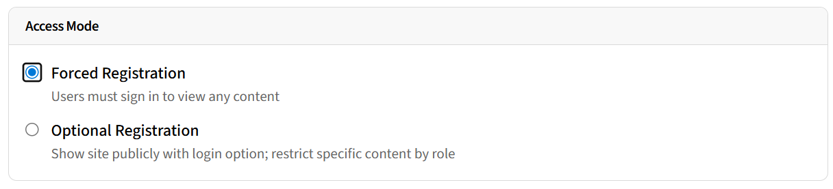 Forced - prevents users accessing any content until logged in. Can be restricted to roles as necessary